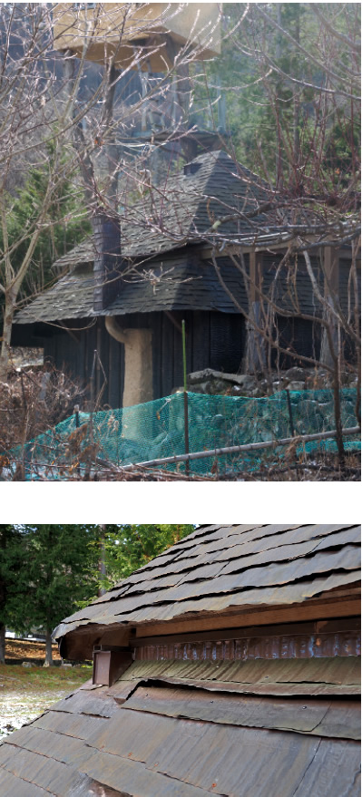 新国立競技場の斜向かいに建つ茶室「五庵」は、これまで藤森が数多く作ってきた茶室の最新作。ここでも屋根は銅板だ。2021東京オリンピック関連施設である茶室の仕上げ材は銅板、焼き杉、漆喰で工学院大学大内田史郎ゼミが協力している。