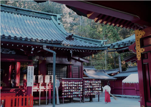 富士山をバックに芦ノ湖の湖上に佇む箱根神社の「平和の鳥居」。昭和27年(1952)、サンフランシスコ講和条約締結と当時の皇太子明仁親王の立太子の礼を記念して建立されたもの。鳥居の扁額は、昭和39年(1964)、東京オリンピック開催と鎮座1,200年を記念して掲げられたもので、吉田茂元首相の筆による「平和」の文字。湖を背に鳥居から階段を上がると、一直線に杉の大木が連なり、樹齢1200年の矢立杉、仇討兄弟の曽我神社を経て、本殿に至る。本殿の背後には県天然記念物に指定された姫沙羅の群生林が広がる。