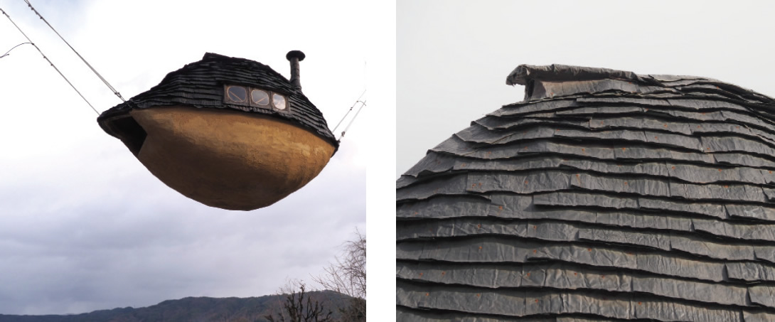 木造の茶室は、長さ2.7m、幅1.8m、高さ2m、重さ600キロ。底部に2本のワイヤを通し、両脇に立てた支柱につるされている。地上から床までは約3.4m。 乗船定員は7人だ。最初はクジラのイメージだったのだが、「作っているうちにフグになってしまった」という。2010年に茅野市美術館で開催された同氏の企画展のワークショップで、一般の参加者とともに制作した。屋根の銅板は地元の小学生たちと一緒にたたいて、デコボコを作ったそうだ。