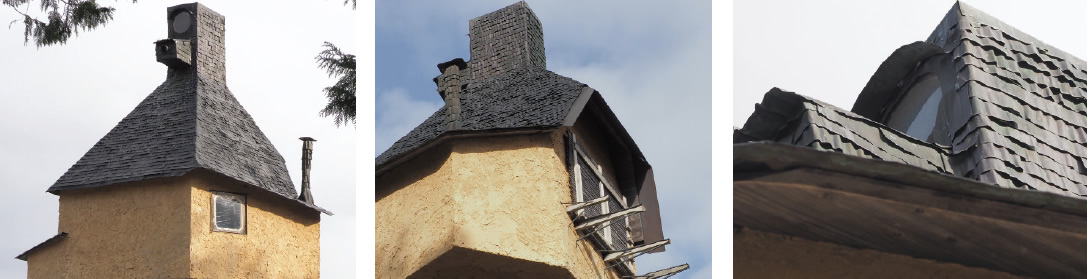 〇銅板はほかの金属板とちがい、人の手作業での対応可能で、銅板を手で曲げ重ね葺きすると、樹皮葺きに通ずる味わい深さが生まれる。また工業製品とちがい風化の過程が味わい深い。