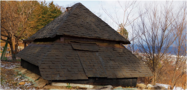 神長官守矢史料館の奥の畑を、標識に沿って上っていくと、2011年に茅野市美術館での藤森照信展で設計・制作・展示後に移築された茶室「空飛ぶ泥舟」が浮かんでいる。足下の畑から青空をバックに見上げると本当に空を飛んでいるように見える。