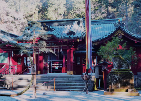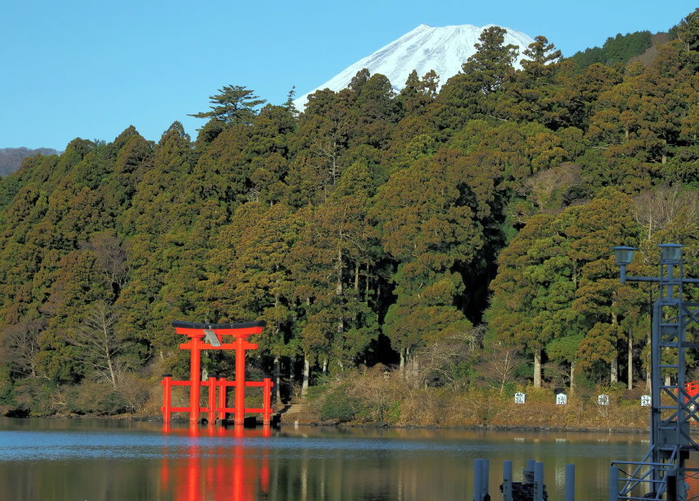 富士山をバックに芦ノ湖の湖上に佇む箱根神社の「平和の鳥居」。昭和27年(1952)、サンフランシスコ講和条約締結と当時の皇太子明仁親王の立太子の礼を記念して建立されたもの。鳥居の扁額は、昭和39年(1964)、東京オリンピック開催と鎮座1,200年を記念して掲げられたもので、吉田茂元首相の筆による「平和」の文字。湖を背に鳥居から階段を上がると、一直線に杉の大木が連なり、樹齢1200年の矢立杉、仇討兄弟の曽我神社を経て、本殿に至る。本殿の背後には県天然記念物に指定された姫沙羅の群生林が広がる。