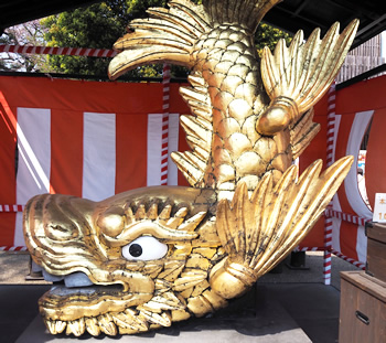 「しゃち」とも「しゃちほこ」とも読まれます。天守の大棟の両端に向かい合わせで飾られます。頭が虎で体は魚という架空の霊獣で火災から建物を守ります。初代の鯱は慶長17年(1612年)の生まれ。慶長大判1940枚分の金の板が使われ、現在の価格では20億円相当といわれています。