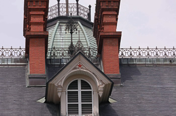 煉瓦、スレート、銅板といえばネオバロック様式建築の屋根の3点セット。窓上部のアーチやドーマー窓に様式の特徴が表れている。フランス積み250万個のレンガは、地元、白石村と豊平村で焼かれ、天然スレートは宮城県雄勝町(現在の石巻市)の天然スレートを取り寄せて葺かれた。
