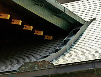 大将軍社は、その後、大阪天満宮の摂社として祀られる。こうしたことから、小さいながら社殿の屋根は特に立派だ。上右の写真を見ていただきたい。本殿側面の登竜門の両脇にとどまらず、各所に配置された竪樋が天に登る龍に見える。