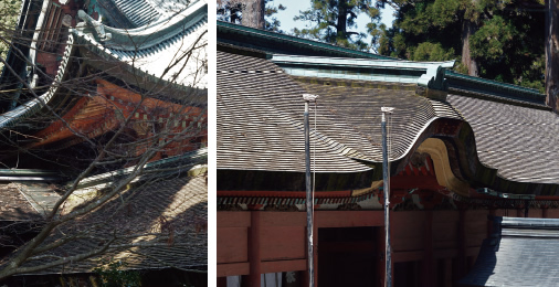 足場の上から、栩(とち)葺きの詳細や銅板の棟包み、鬼との取り合いなど、細かな技を間近に見て、堪能できる。本尊の薬師さんや最澄さんには申し訳ないが、お参りもそこそこに、屋根に見入ってしまう。廻廊の屋根は、栩葺きで厚さ2.4cm、長さ30cmの板を、8.5cmずつずらして留めている。屋根全体に、板が割れたり、軒先が腐朽するなどの破損が見られるため、軒付を含めた屋根全面の葺き替えにいたった。