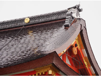 銅板は2,500枚が必要で、棟瓦は舞殿用に八寸角を40枚、南楼門用に尺版角を45枚限定で受け付け、それぞれ住所、氏名、祈願を墨書して屋根に葺かれた。尺版瓦は10万円、八寸」瓦は8万円、銅板は5千円。もちろん屋根業界からの寄進もあった。
