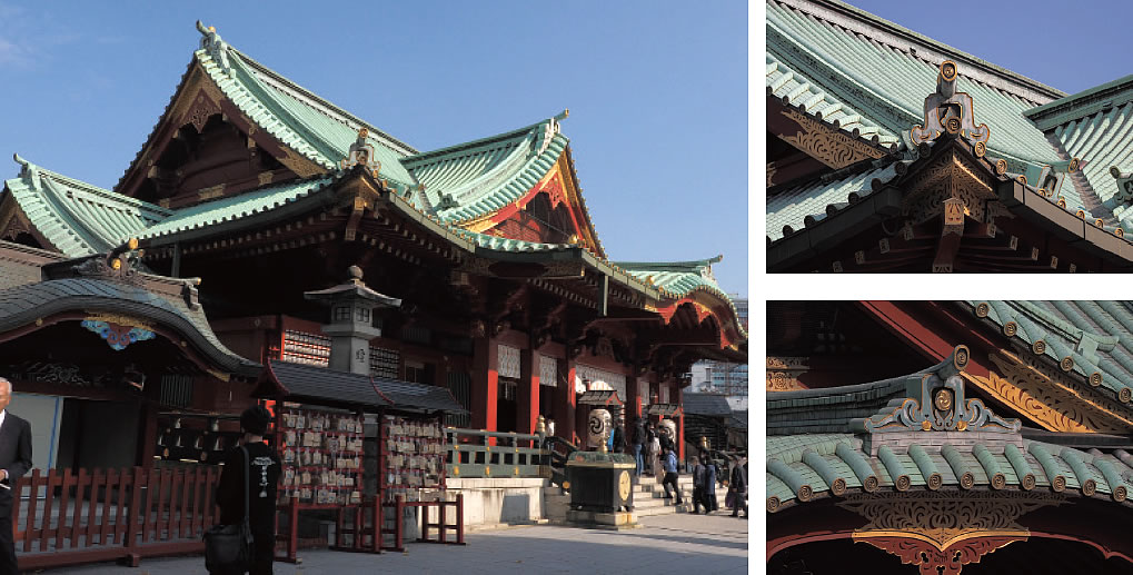 (写真中)神社のお守りにもなっている「水鳥」。拝殿の大棟の両端、下がり棟・隅棟の先端など、屋根のあちこちで、社殿を火から守っている。(写真右)手水舎の銅屋根にも水鳥と鳳凰。