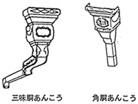 軒どいと竪どいをつなぐ部材の名称をあんこうと呼んでいます。形状は図のようなもので、「三味胴」と「角胴」が代表的なものです。あんこうは鬼板(鬼瓦)などとともに板金職のもっとも腕の揮える部分で、これを作るときは各々最高の技術を屈指したものです。