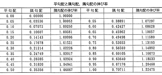 表に平勾配に対する隅勾配と隅勾配の伸び率を掲げます。