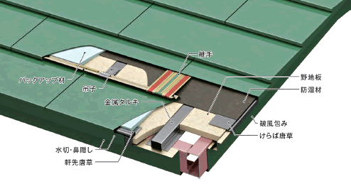 横ぶきは、成形された金属板を横方向にふいていく構法です。基本的にはふき板を水下から水上の方向にふいて仕上げます。横方向の継手は、はぜ組をしない引掛け方式が多くなっています。下地への固定は、吊子によるものと、ふき板の端部を直接釘かねじで留めつけるタイプがあります。この屋根は屋根のラインを横にした点に、意匠上の大きな特徴があります。